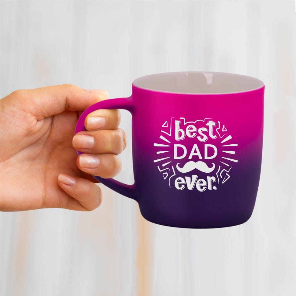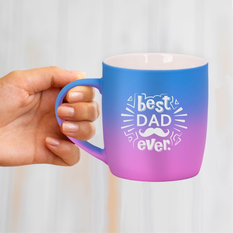 Jego zewnętrzna warstwa koloru przechodzi z jasnej w ciemną. Wnętrze jest jednokolorowe. Kubek jest matowy, miły w dotyku, z wygodnym uchwytem. Nadruk wykonany jest metodą laserową, a kolor graweru to biały.
