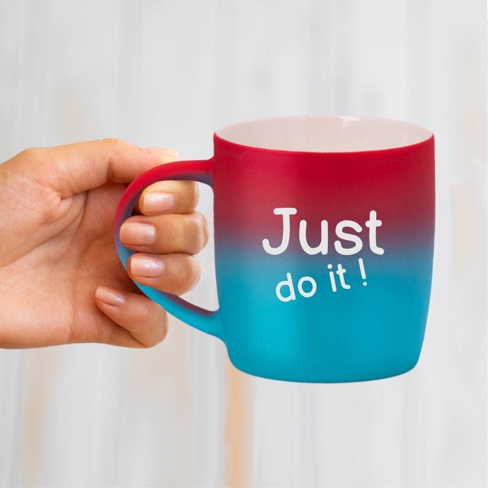 Jego zewnętrzna warstwa koloru przechodzi z jasnej w ciemną. Wnętrze jest jednokolorowe. Kubek jest matowy, miły w dotyku, z wygodnym uchwytem. Nadruk wykonany jest metodą laserową, a kolor graweru to biały.