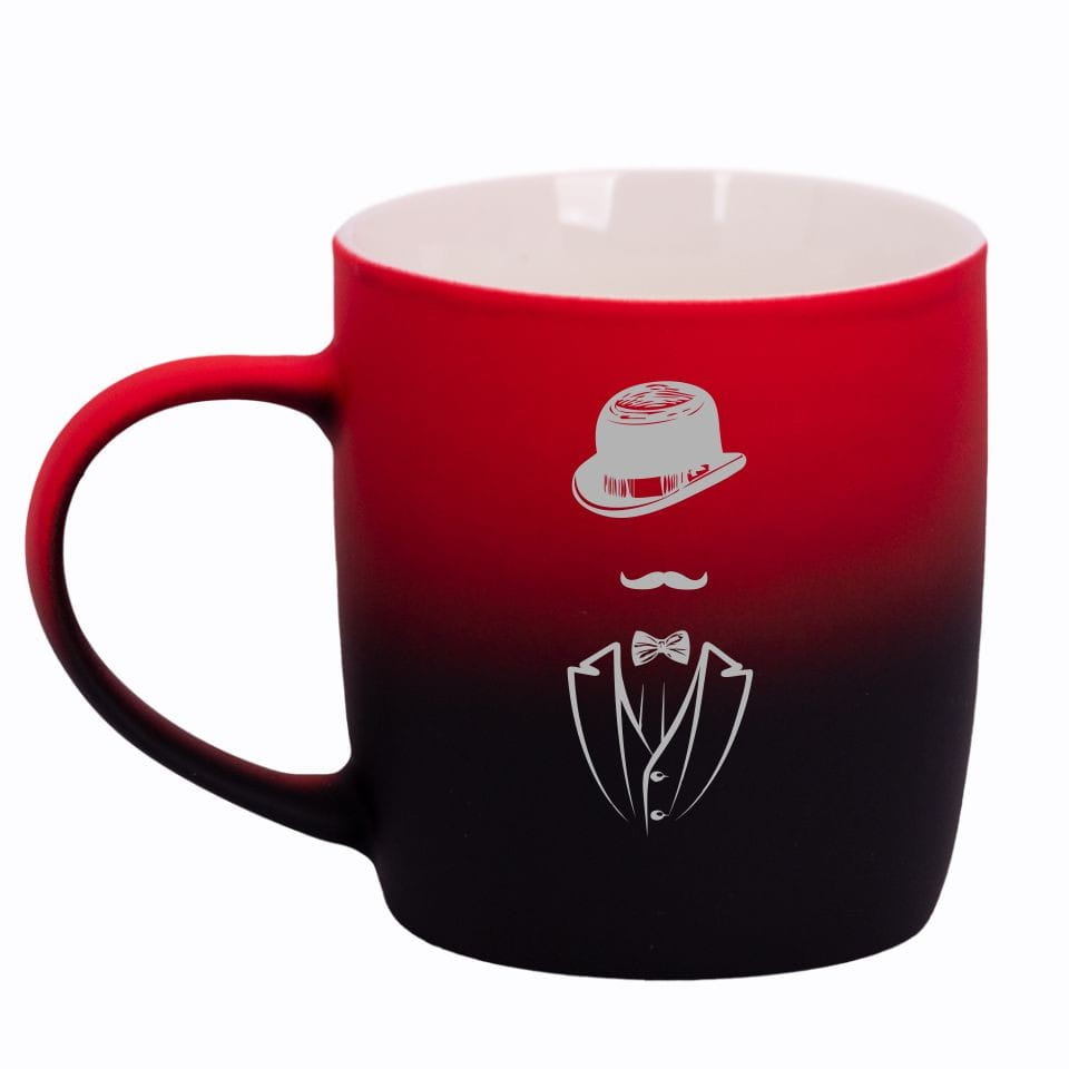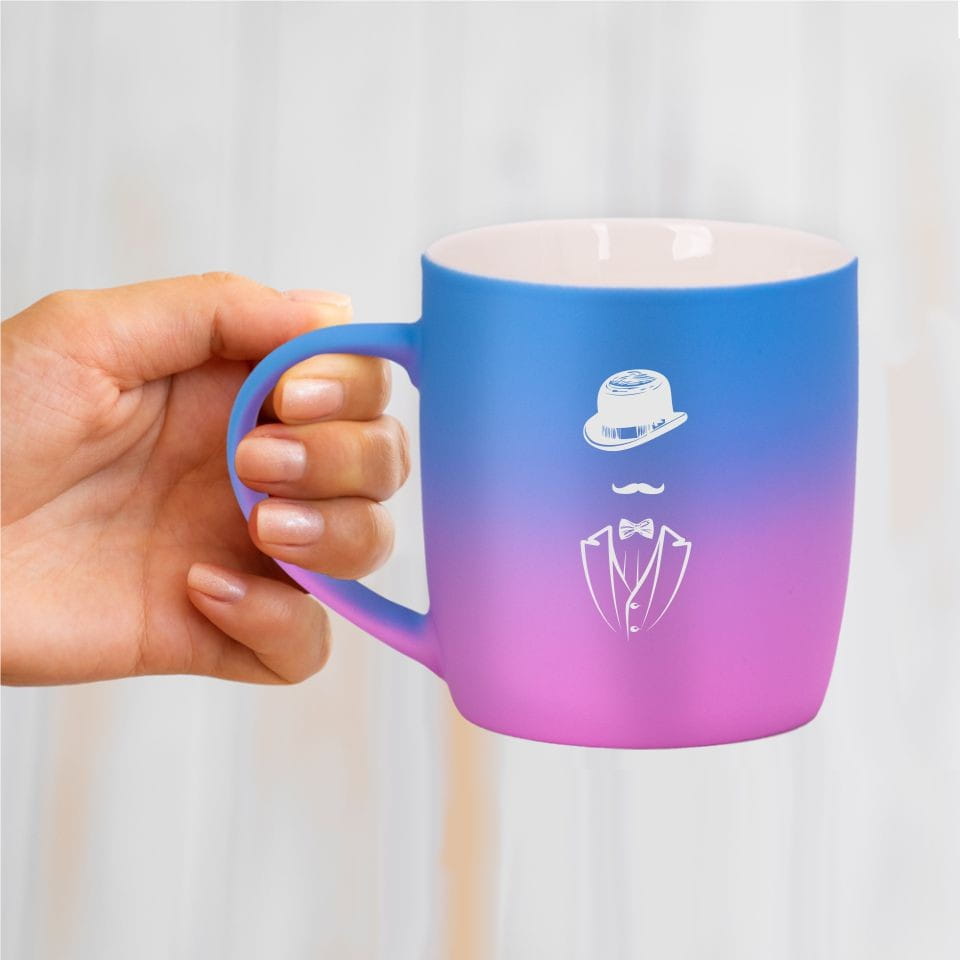 Jego zewnętrzna warstwa koloru przechodzi z jasnej w ciemną. Wnętrze jest jednokolorowe. Kubek jest matowy, miły w dotyku, z wygodnym uchwytem. Nadruk wykonany jest metodą laserową, a kolor graweru to biały.