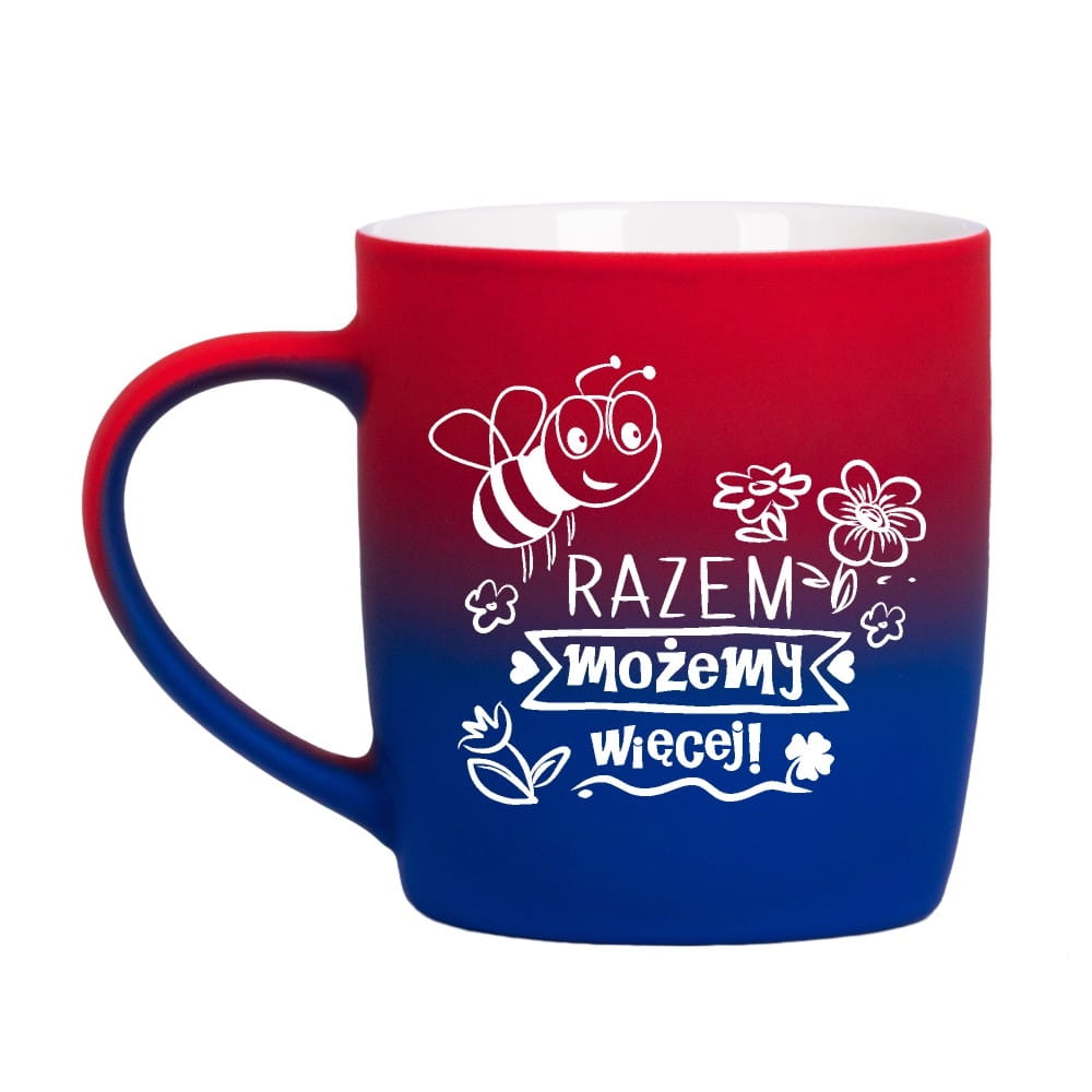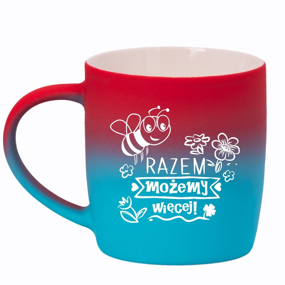 Jego zewnętrzna warstwa koloru przechodzi z jasnej w ciemną. Wnętrze jest jednokolorowe. Kubek jest matowy, miły w dotyku, z wygodnym uchwytem. Nadruk wykonany jest metodą laserową, a kolor graweru to biały.