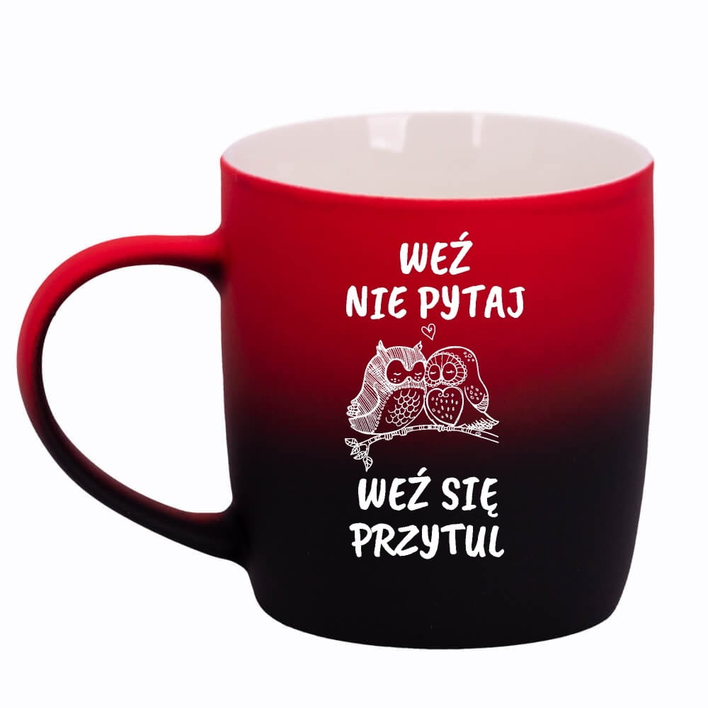 Jego zewnętrzna warstwa koloru przechodzi z jasnej w ciemną. Wnętrze jest jednokolorowe. Kubek jest matowy, miły w dotyku, z wygodnym uchwytem. Nadruk wykonany jest metodą laserową, a kolor graweru to biały.