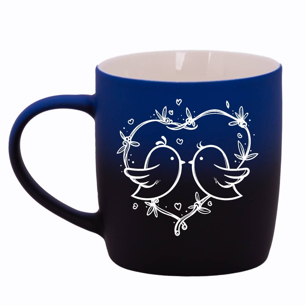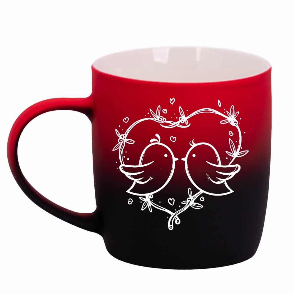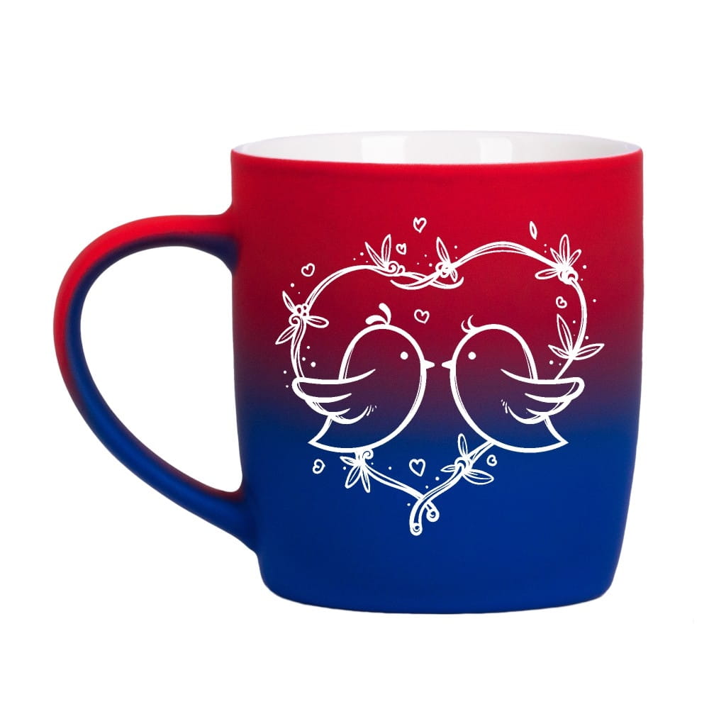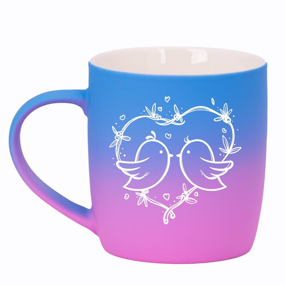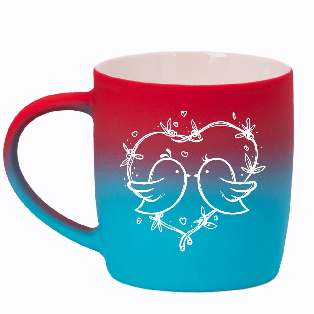 Jego zewnętrzna warstwa koloru przechodzi z jasnej w ciemną. Wnętrze jest jednokolorowe. Kubek jest matowy, miły w dotyku, z wygodnym uchwytem. Nadruk wykonany jest metodą laserową, a kolor graweru to biały.
