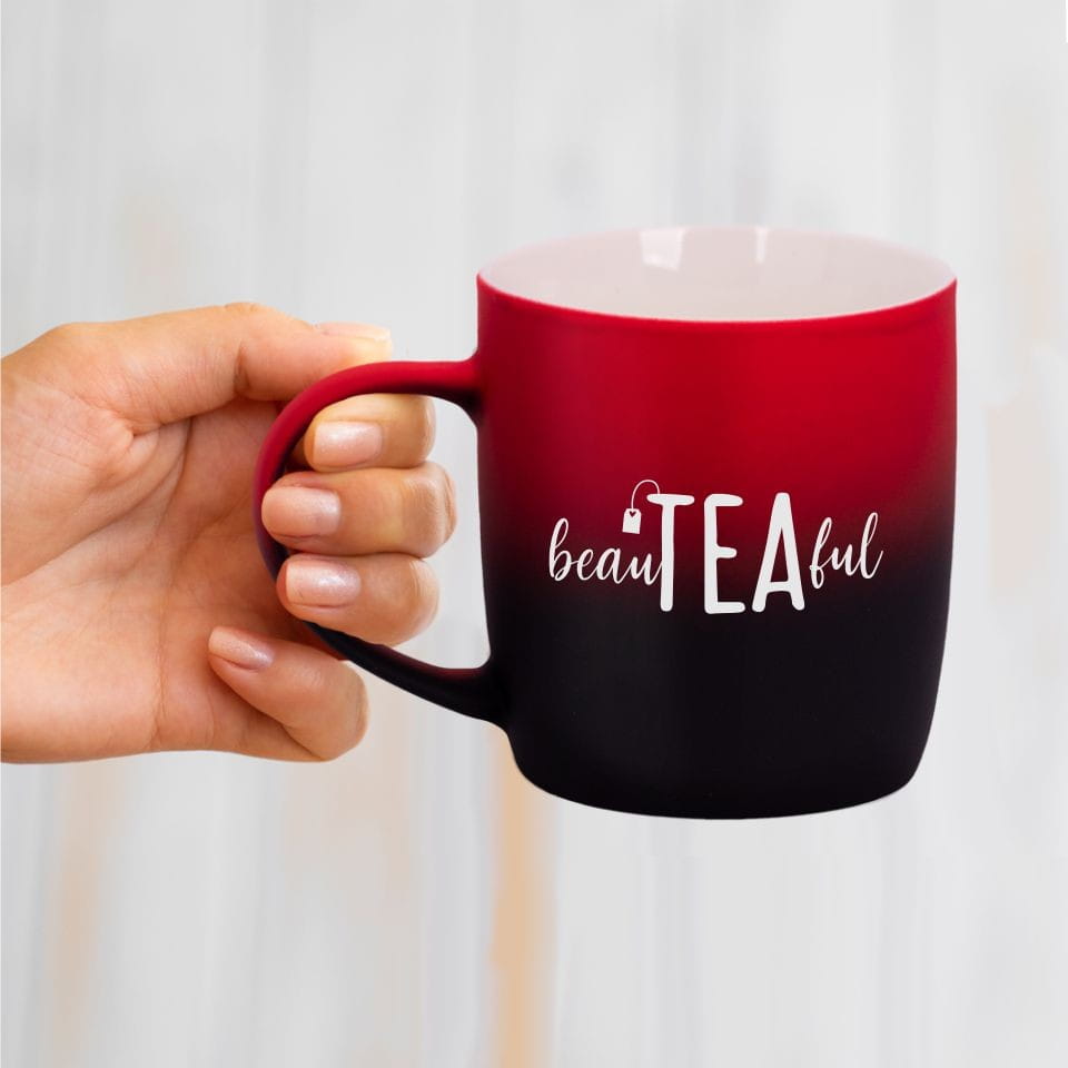 Jego zewnętrzna warstwa koloru przechodzi z jasnej w ciemną. Wnętrze jest jednokolorowe. Kubek jest matowy, miły w dotyku, z wygodnym uchwytem. Nadruk wykonany jest metodą laserową, a kolor graweru to biały.
