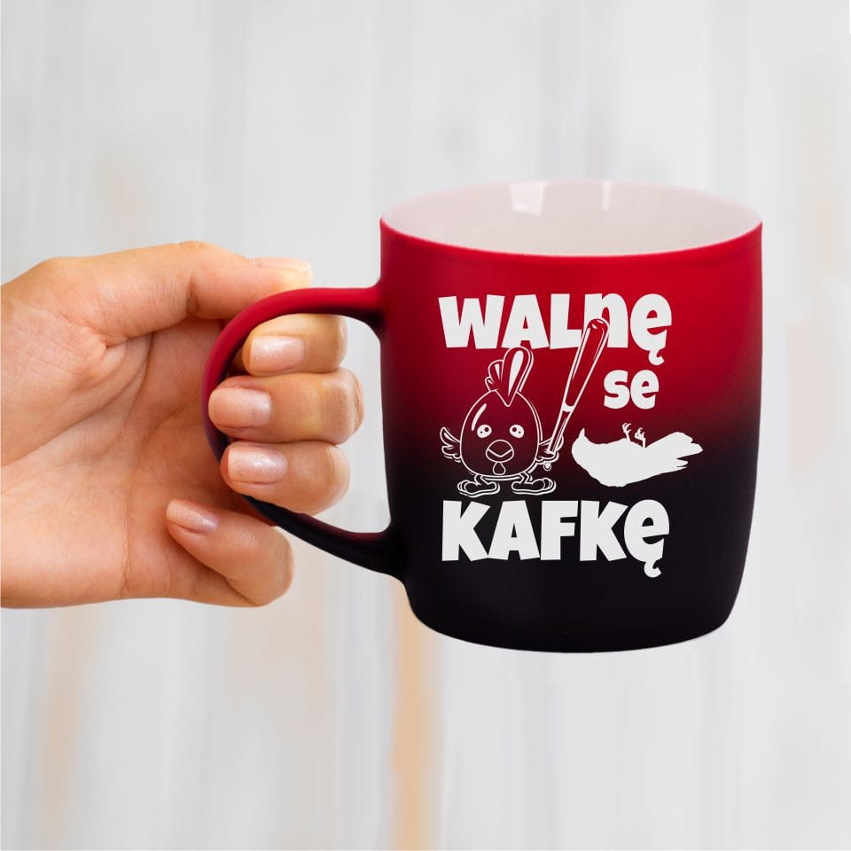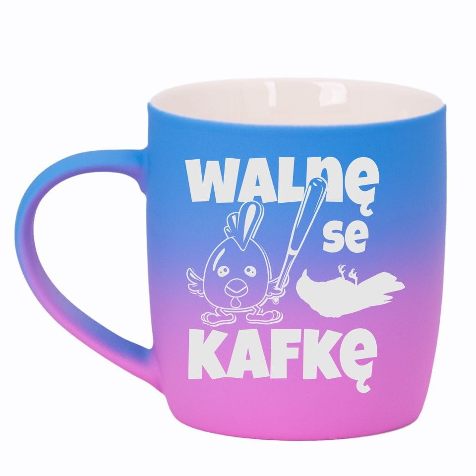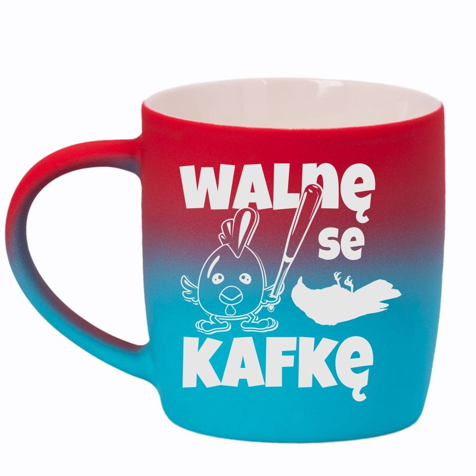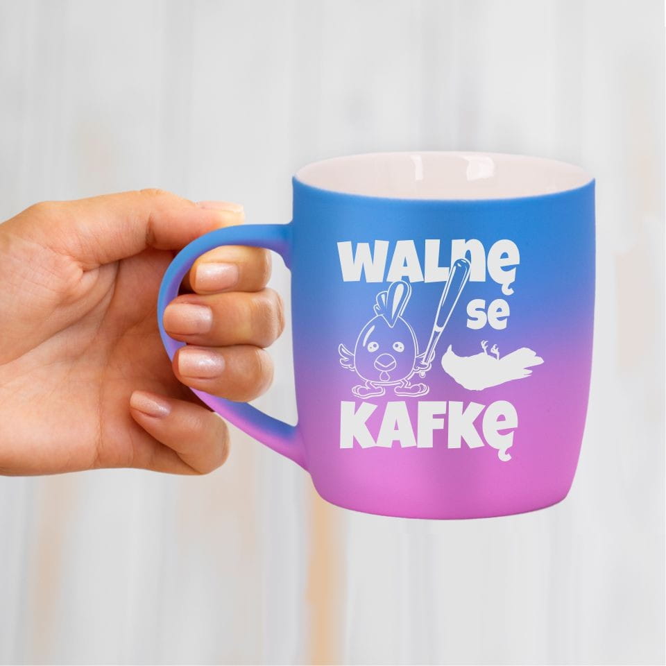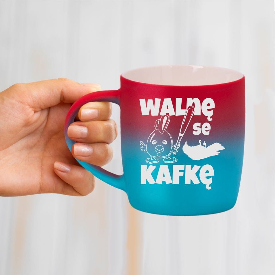 Jego zewnętrzna warstwa koloru przechodzi z jasnej w ciemną. Wnętrze jest jednokolorowe. Kubek jest matowy, miły w dotyku, z wygodnym uchwytem. Nadruk wykonany jest metodą laserową, a kolor graweru to biały.