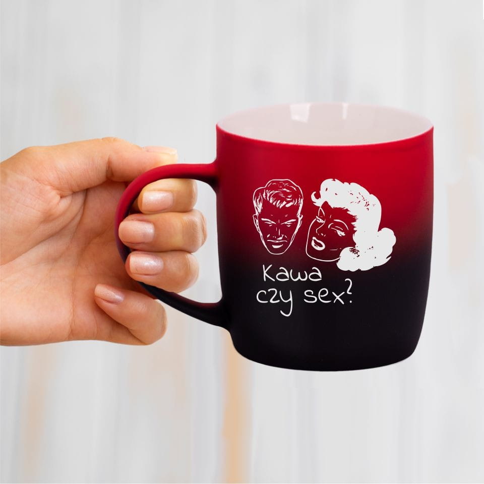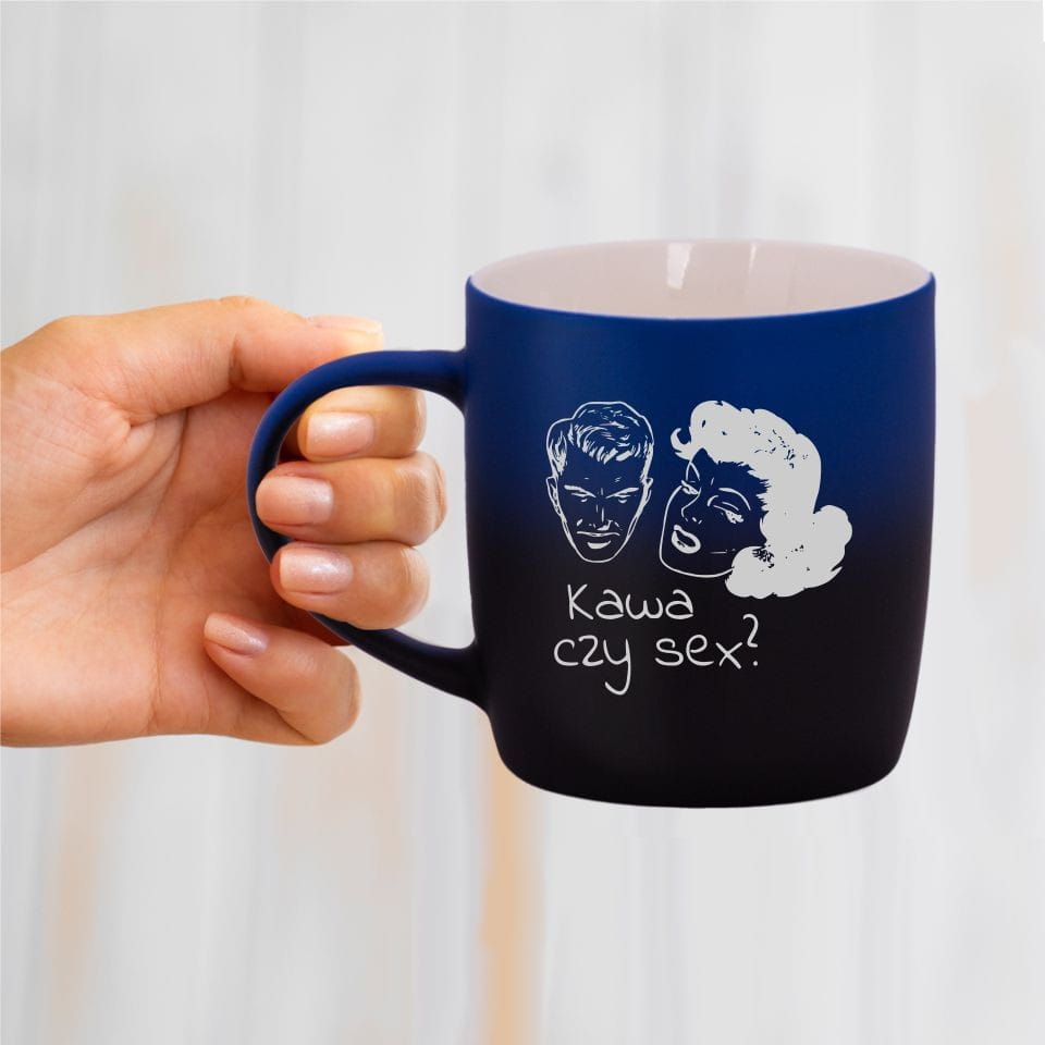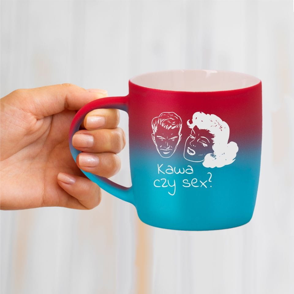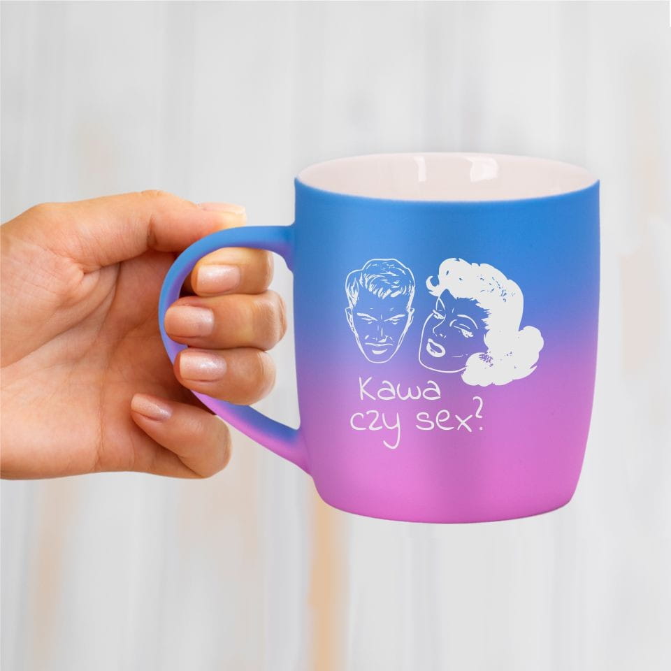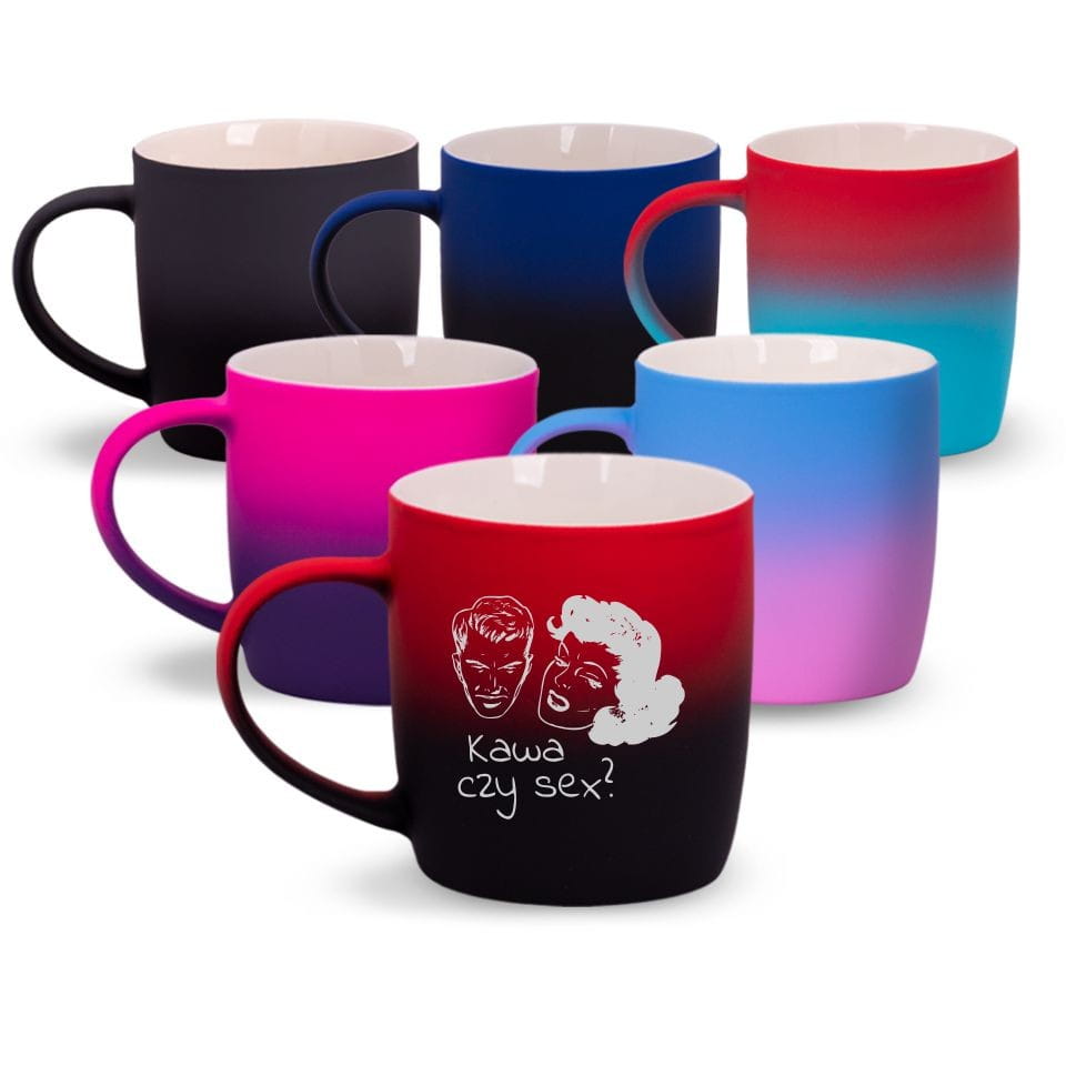 Jego zewnętrzna warstwa koloru przechodzi z jasnej w ciemną. Wnętrze jest jednokolorowe. Kubek jest matowy, miły w dotyku, z wygodnym uchwytem. Nadruk wykonany jest metodą laserową, a kolor graweru to biały.