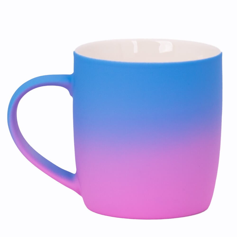 Jego zewnętrzna warstwa koloru przechodzi z jasnej w ciemną. Wnętrze jest jednokolorowe. Kubek jest matowy, miły w dotyku, z wygodnym uchwytem. Nadruk wykonany jest metodą laserową, a kolor graweru to biały.