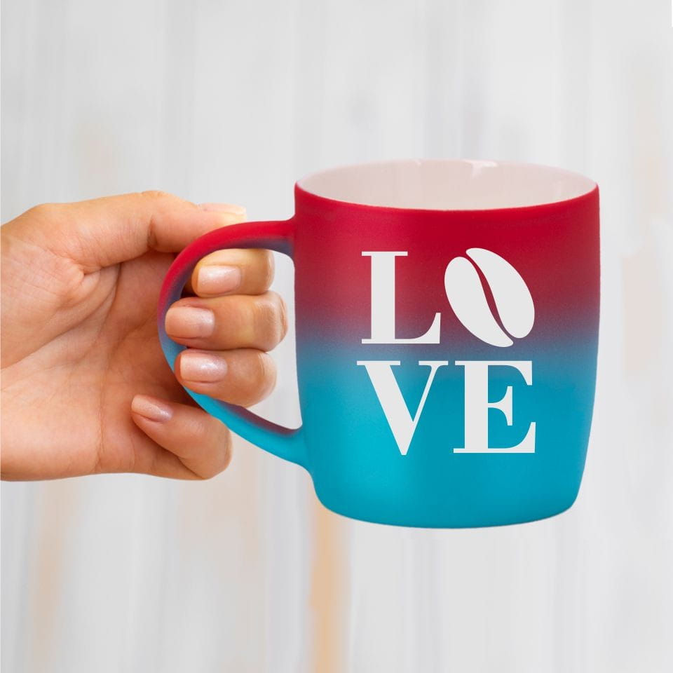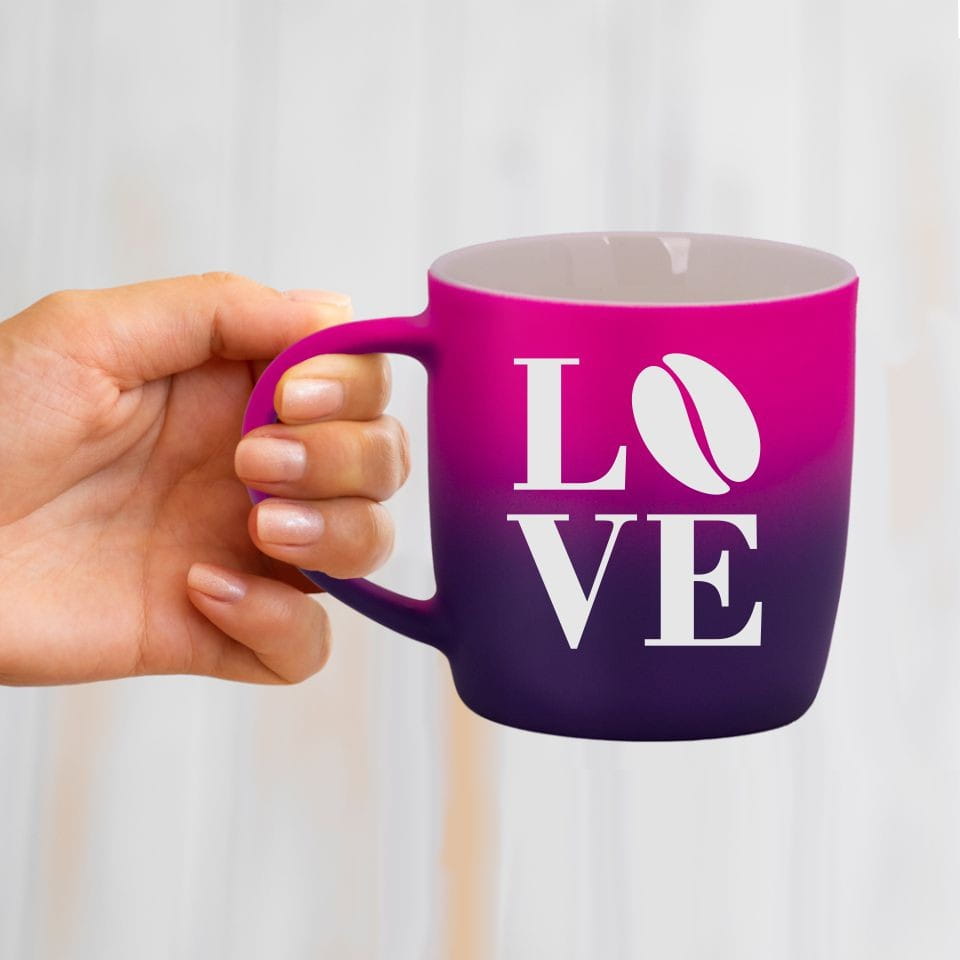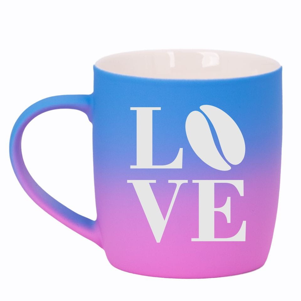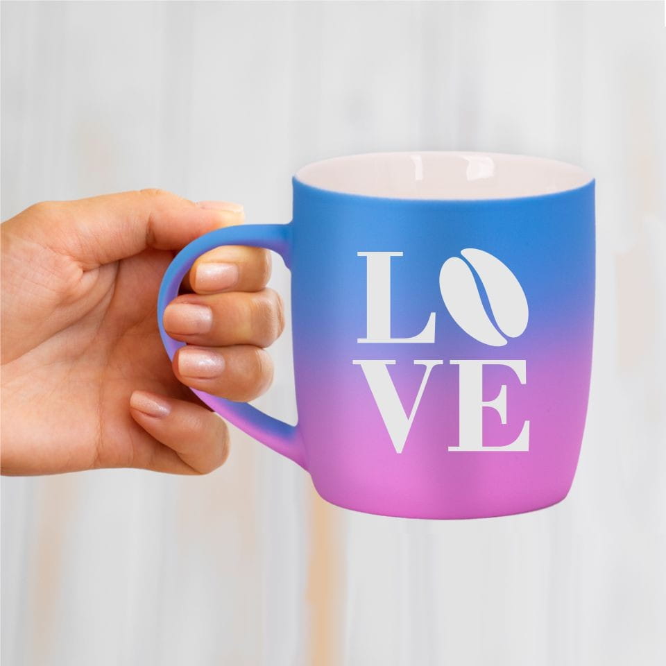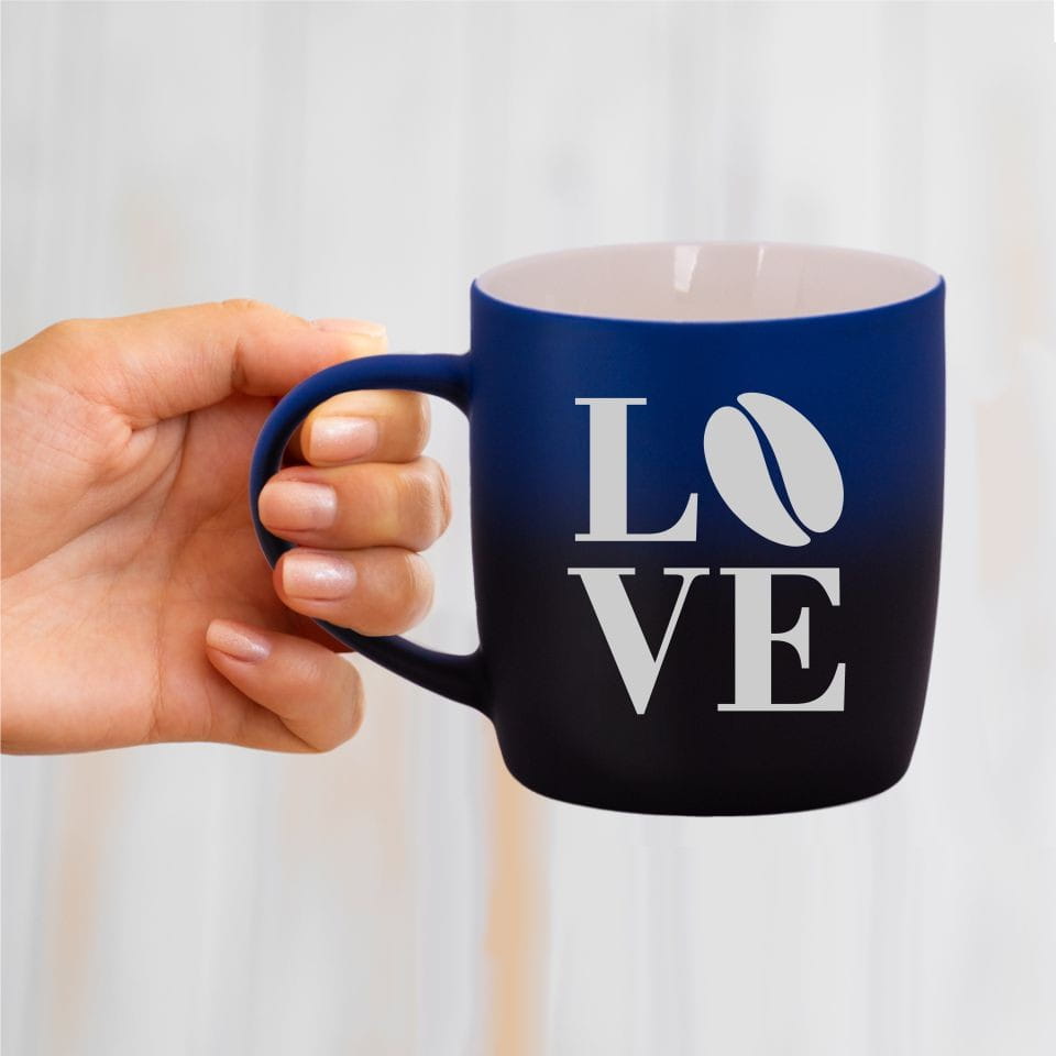 Jego zewnętrzna warstwa koloru przechodzi z jasnej w ciemną. Wnętrze jest jednokolorowe. Kubek jest matowy, miły w dotyku, z wygodnym uchwytem. Nadruk wykonany jest metodą laserową, a kolor graweru to biały.