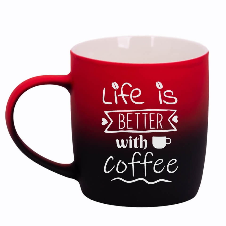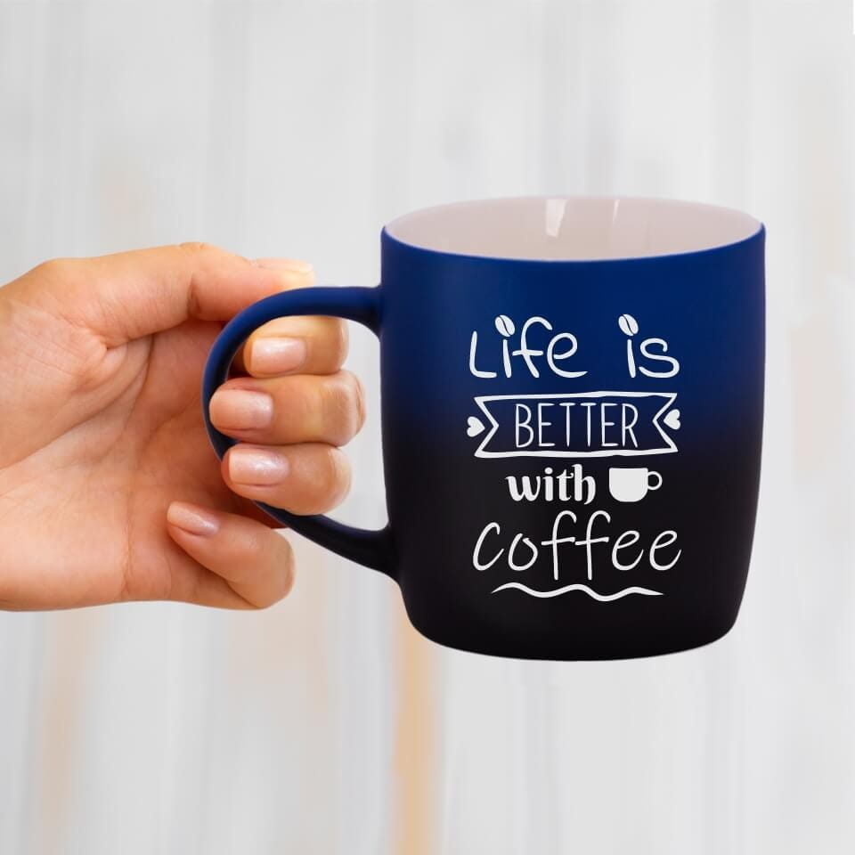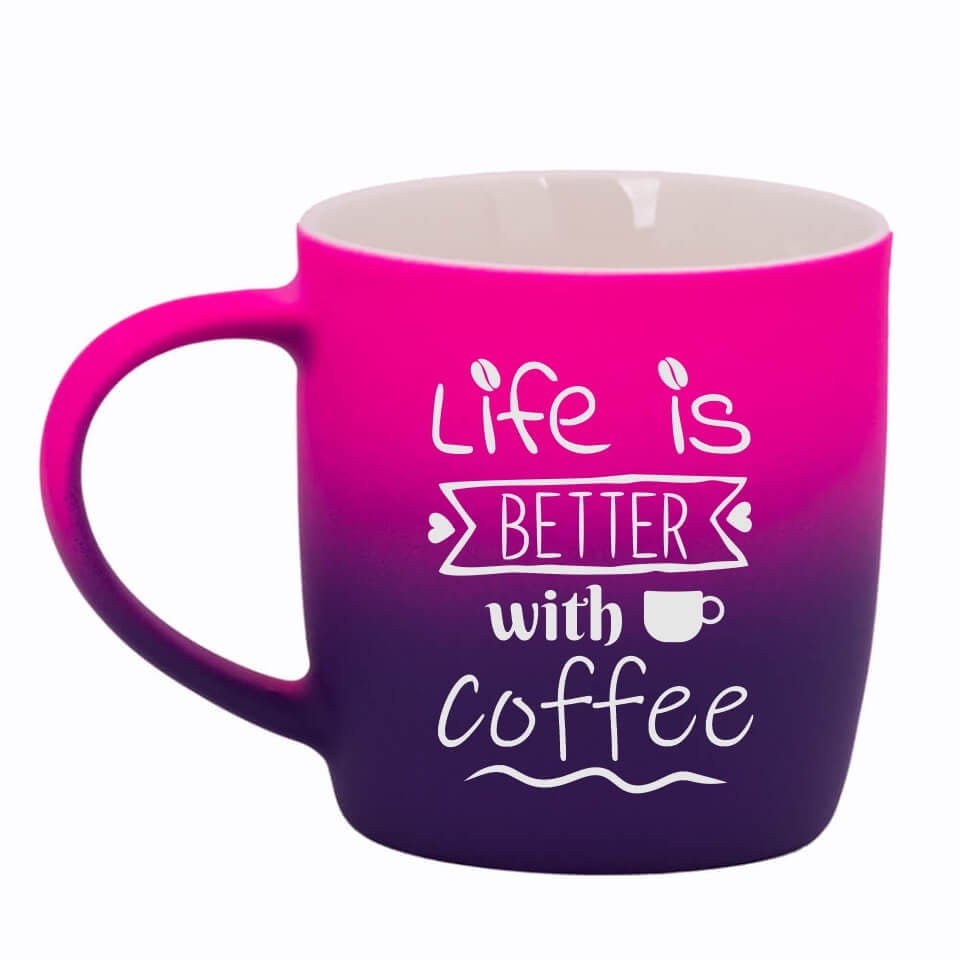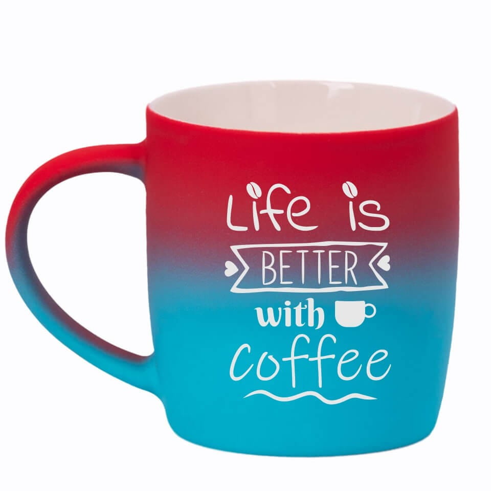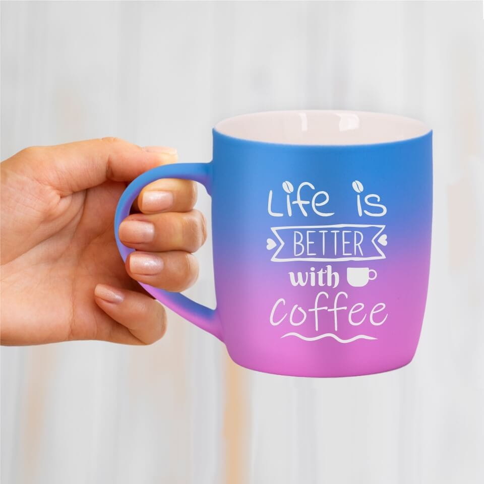 Jego zewnętrzna warstwa koloru przechodzi z jasnej w ciemną. Wnętrze jest jednokolorowe. Kubek jest matowy, miły w dotyku, z wygodnym uchwytem. Nadruk wykonany jest metodą laserową, a kolor graweru to biały.