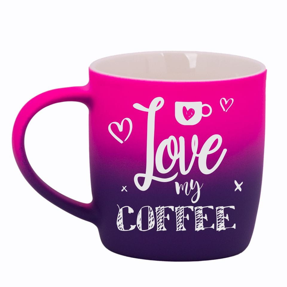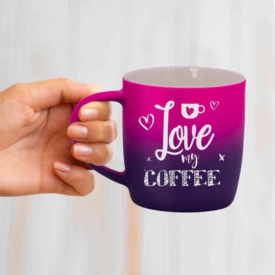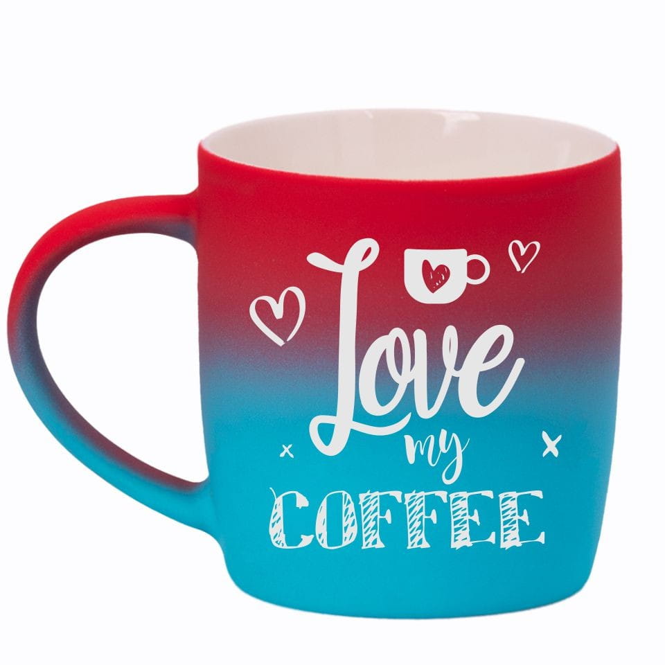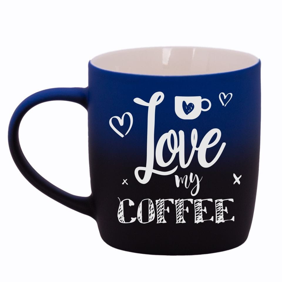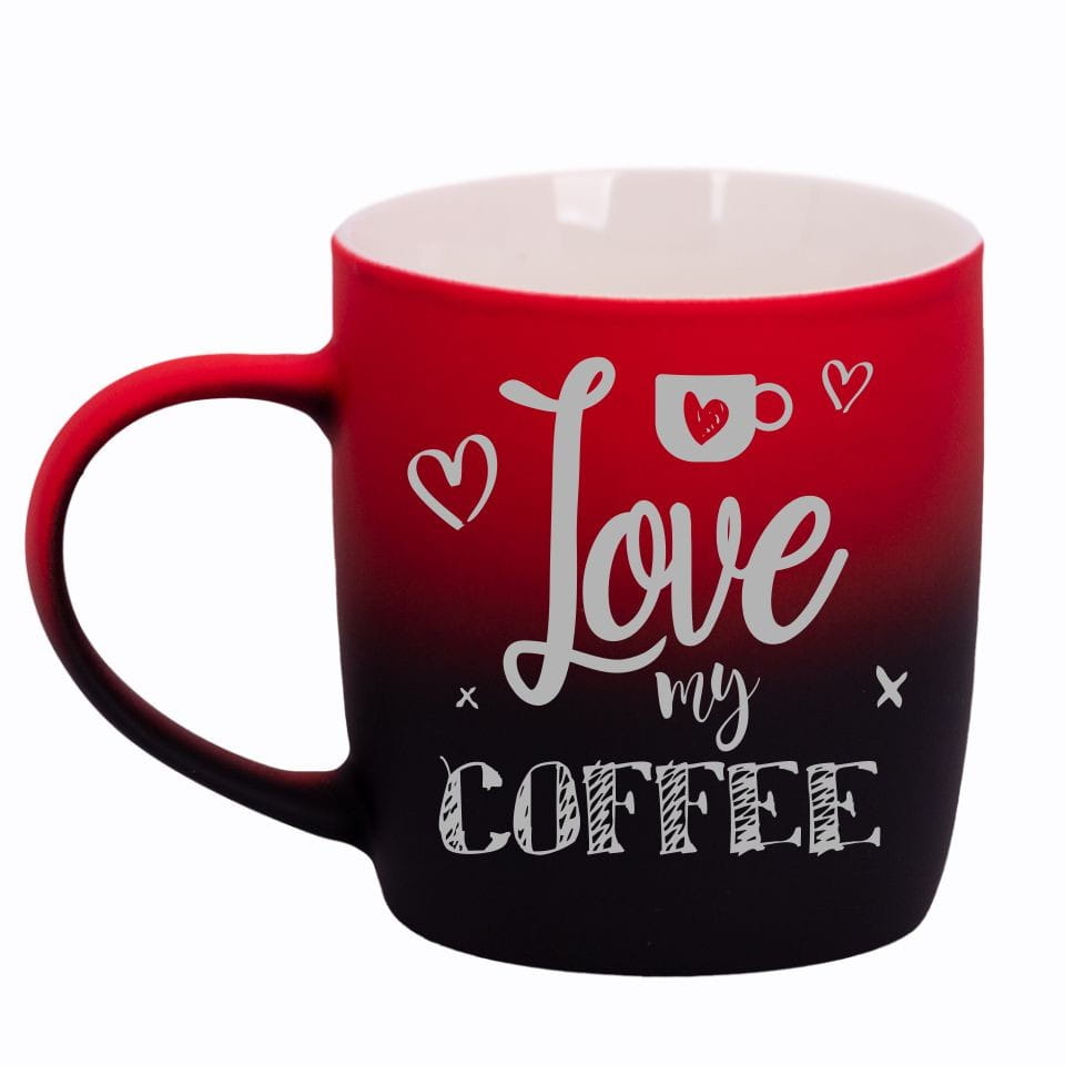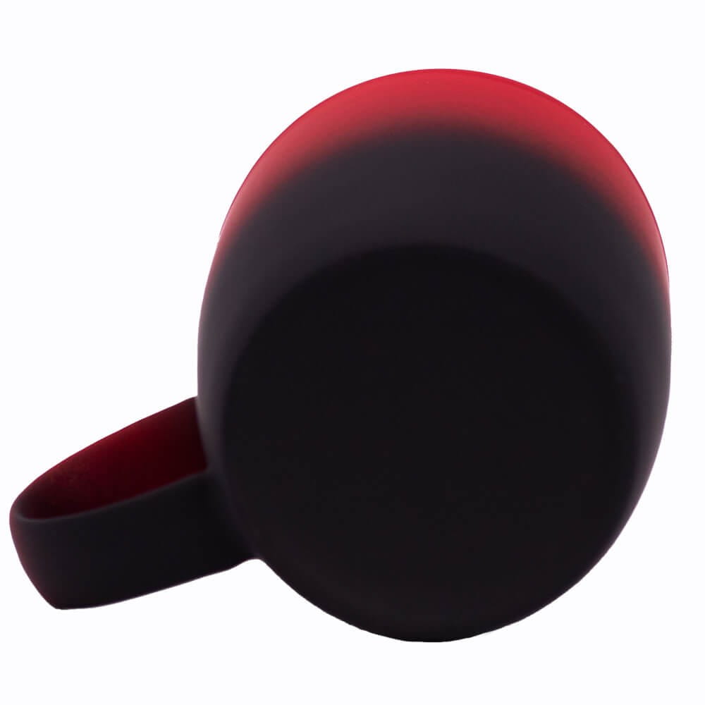 Jego zewnętrzna warstwa koloru przechodzi z jasnej w ciemną. Wnętrze jest jednokolorowe. Kubek jest matowy, miły w dotyku, z wygodnym uchwytem. Nadruk wykonany jest metodą laserową, a kolor graweru to biały.