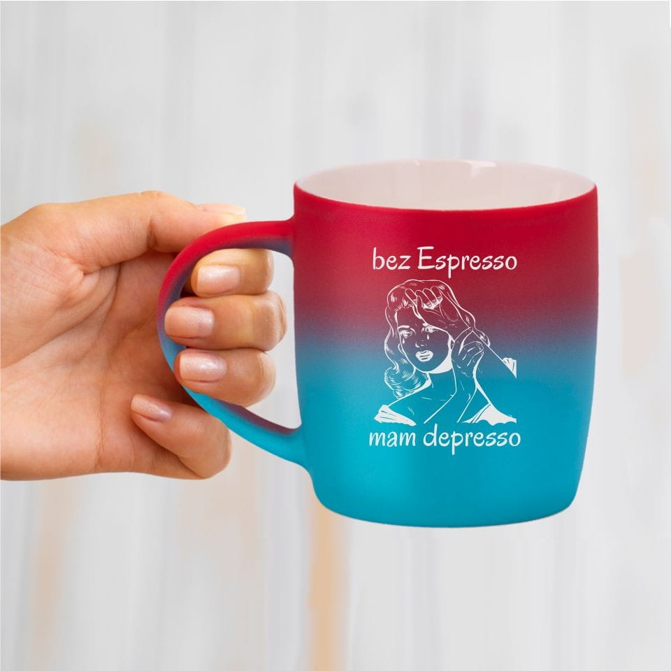 Jego zewnętrzna warstwa koloru przechodzi z jasnej w ciemną. Wnętrze jest jednokolorowe. Kubek jest matowy, miły w dotyku, z wygodnym uchwytem. Nadruk wykonany jest metodą laserową, a kolor graweru to biały.