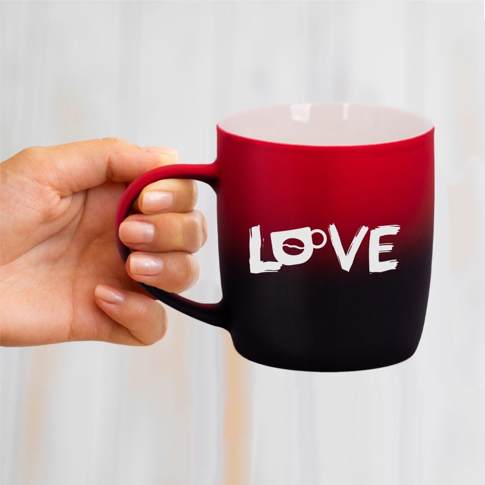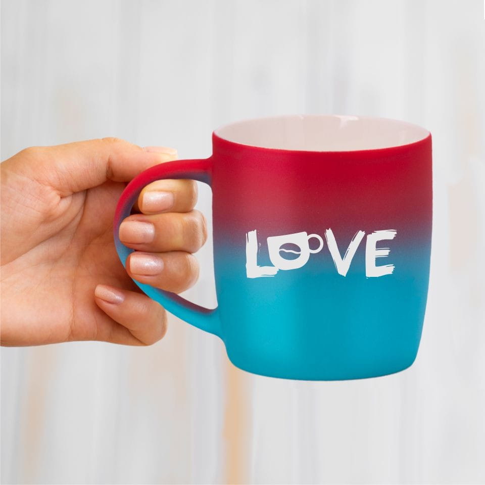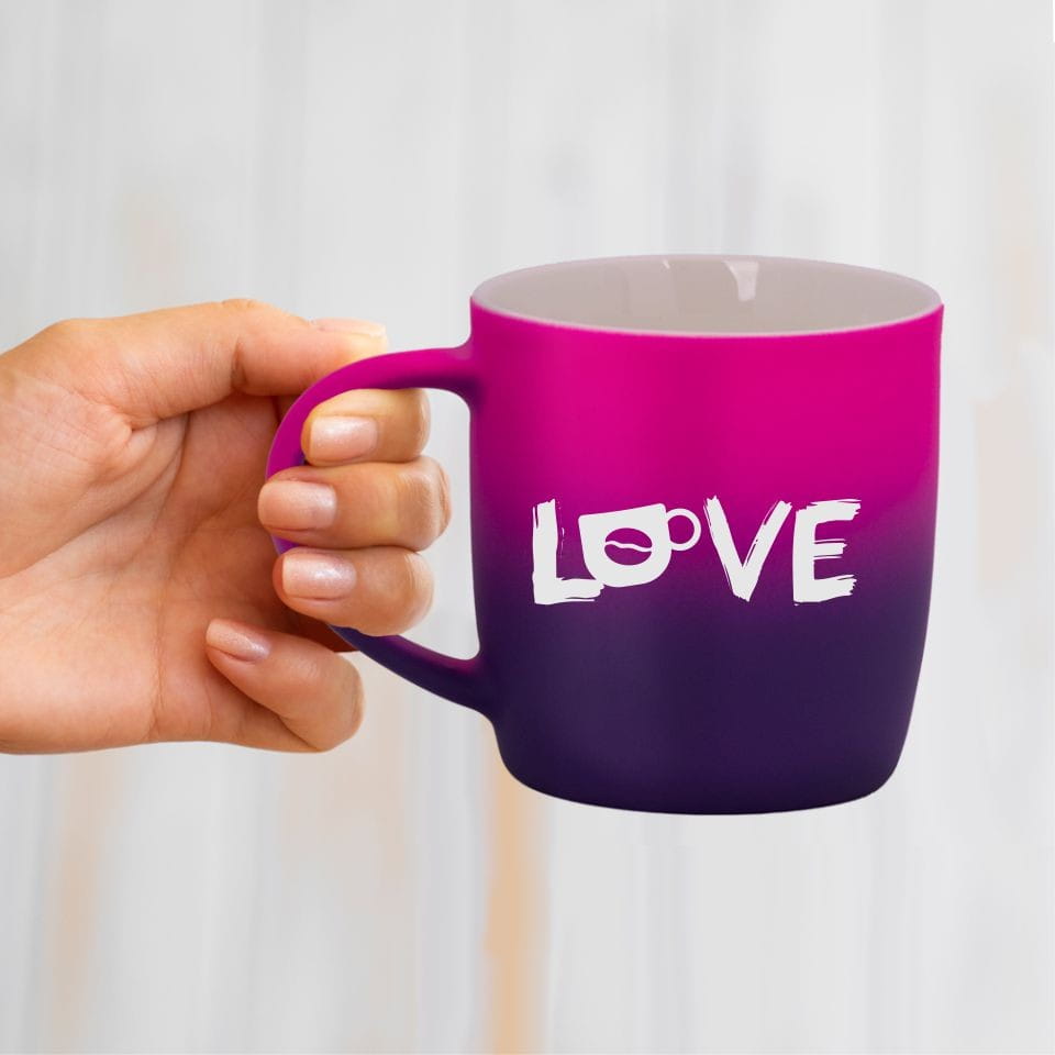 Jego zewnętrzna warstwa koloru przechodzi z jasnej w ciemną. Wnętrze jest jednokolorowe. Kubek jest matowy, miły w dotyku, z wygodnym uchwytem. Nadruk wykonany jest metodą laserową, a kolor graweru to biały.