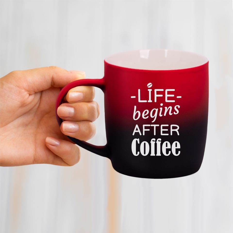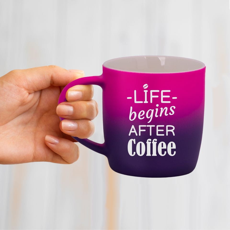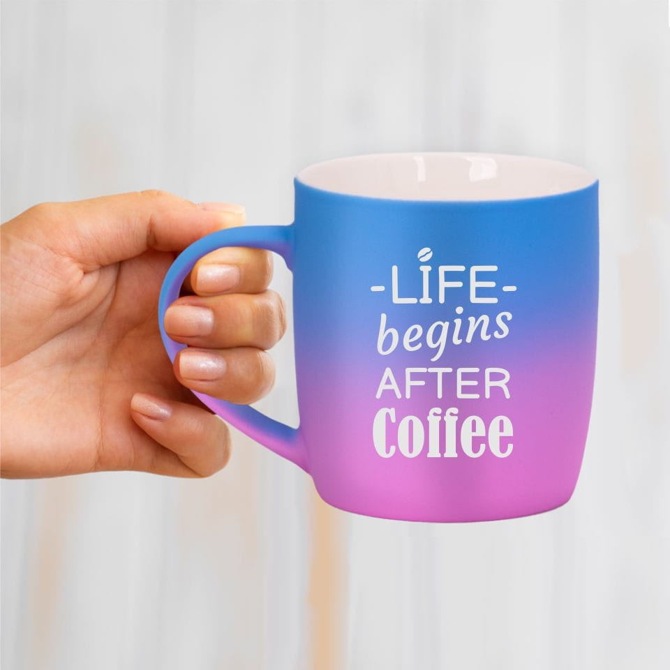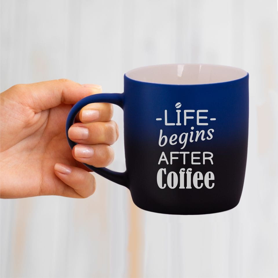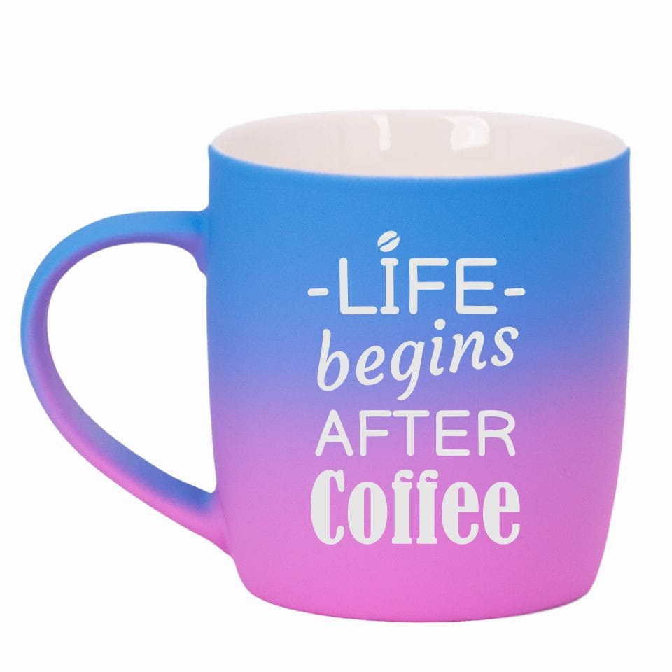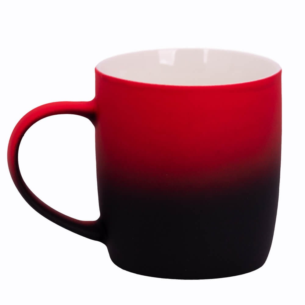 Jego zewnętrzna warstwa koloru przechodzi z jasnej w ciemną. Wnętrze jest jednokolorowe. Kubek jest matowy, miły w dotyku, z wygodnym uchwytem. Nadruk wykonany jest metodą laserową, a kolor graweru to biały.