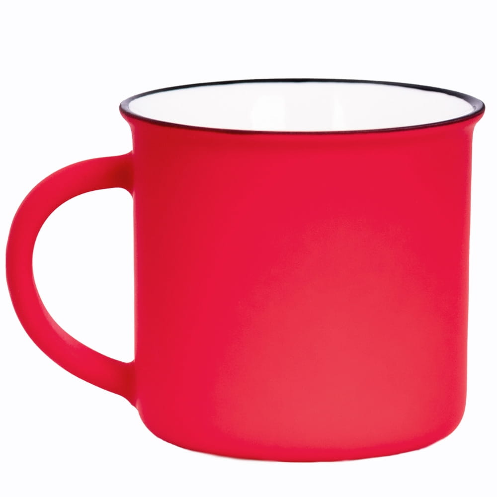 Kubek ceramiczny stylizowany na kubek retro PRL z wygrawerowanym metodą laserową hasłem i grafiką.
