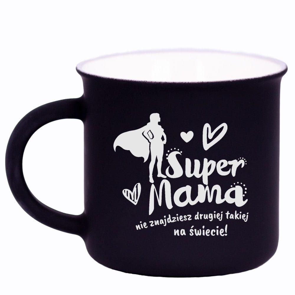Kubek ceramiczny stylizowany na kubek retro PRL z wygrawerowanym metodą laserową hasłem i grafiką.