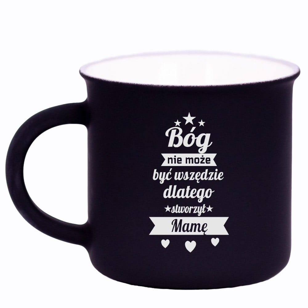 Kubek ceramiczny stylizowany na kubek retro PRL z wygrawerowanym metodą laserową hasłem i grafiką.