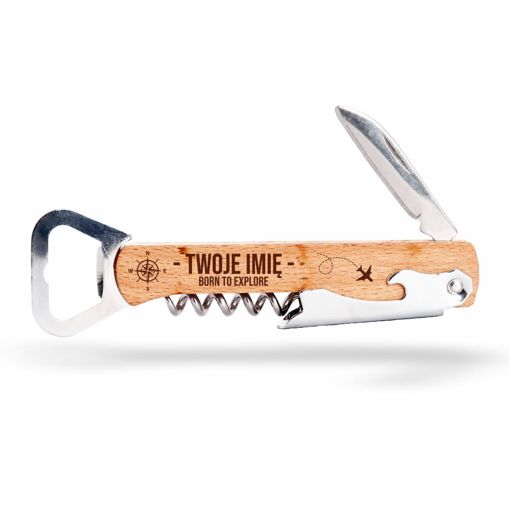 Drewniany otwieracz do butelek z korkociągiem i nożem – praktyczny, solidny i elegancki gadżet