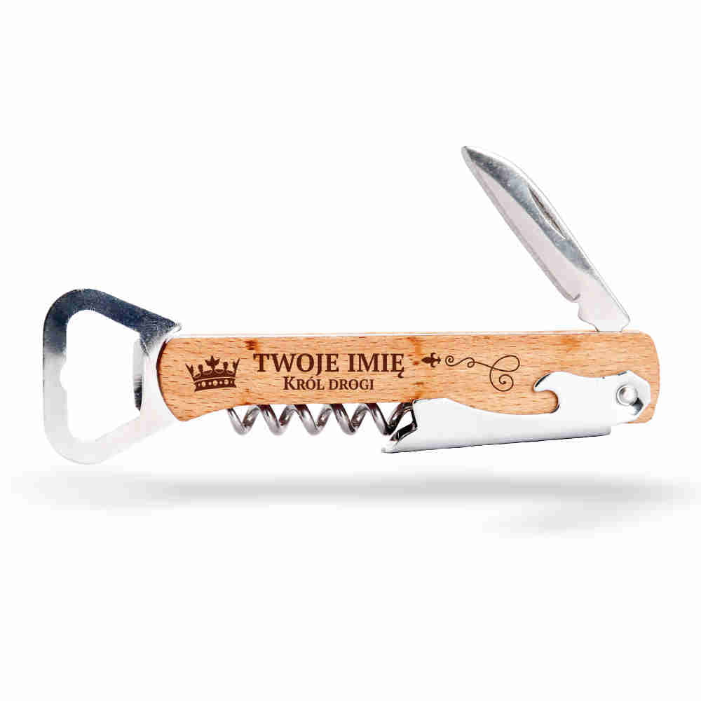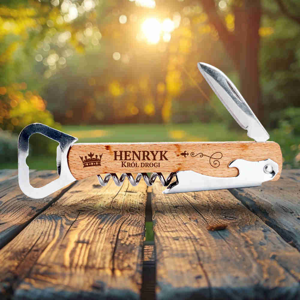 Drewniany otwieracz do butelek z korkociągiem i nożem – praktyczny, solidny i elegancki gadżet