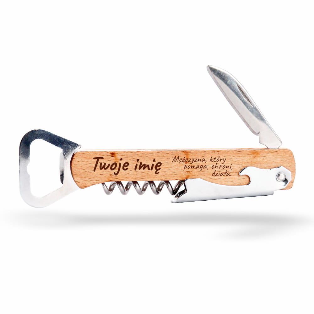Drewniany otwieracz do butelek z korkociągiem i nożem – praktyczny, solidny i elegancki gadżet