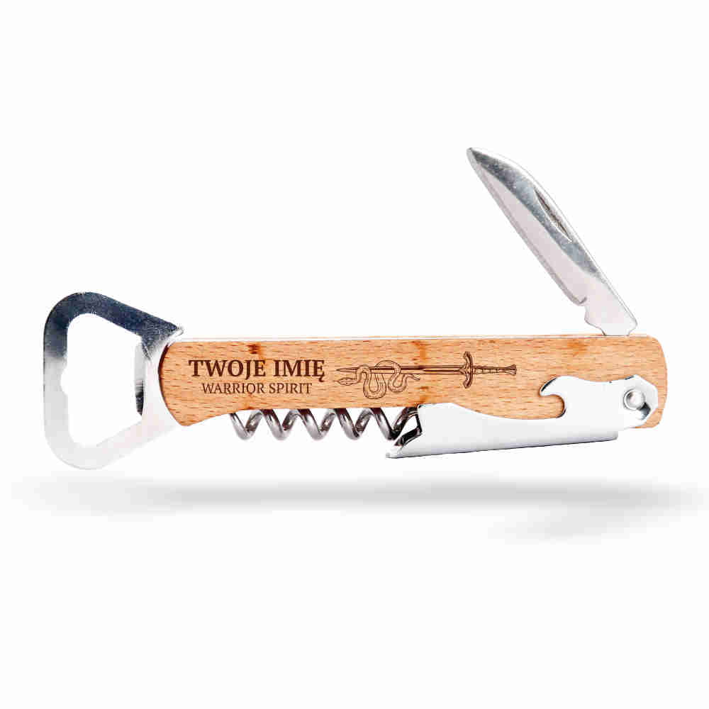 Drewniany otwieracz do butelek z korkociągiem i nożem – praktyczny, solidny i elegancki gadżet