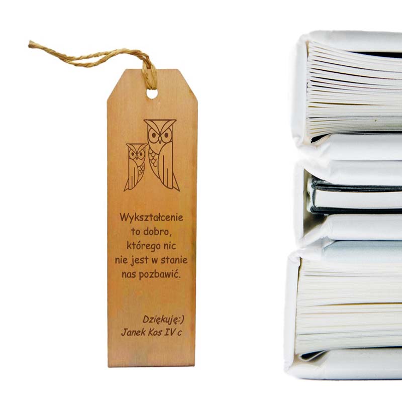 Szukasz idealnego prezentu, który zostawi trwałe wspomnienia? Grawerowana drewniana zakładka do książki jest doskonałym wyborem! Ta oryginalna i osobista pamiątka sprawi, że obdarowana osoba z uśmiechem na ustach będzie wspominać Ciebie, swoją klasę lub ulubionego nauczyciela za każdym razem, gdy sięgnie po swoją ulubioną lekturę.